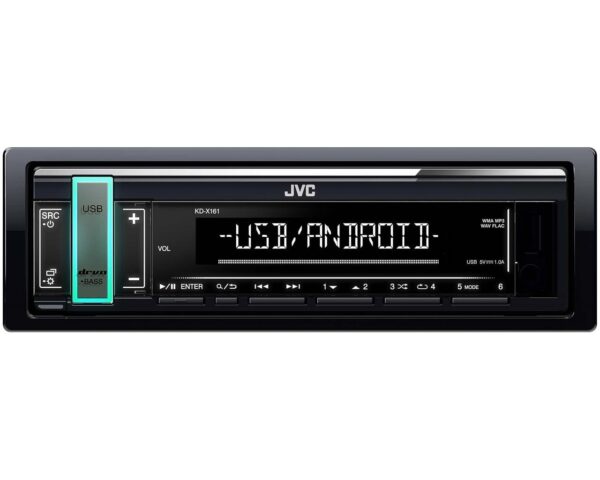 JVC KD-X161, lühikese korpusega, digitaalse meediumivastuvõtja eesmise USB- ja AUX-sisendpesaga muude kaasaskantavate muusikasalvestustoodete jaoks. Suur hõlpsasti loetav LCD-ekraan näitab selgelt kogu teavet koos valge klahvivalgustuse ja muutuva värviga multifunktsionaalse lülitusklahviga, mis hõlbustab kasutamist. Seadmel on roolinuppude juhtimise valmidus ja võimas 4x 50W võimendi. Juhul, kui soovid lisada võimendit on tagapaneelil 2,5V RCA Preout. Pange tähele, et see mudel ei sisalda CD-mehhanismi, kuid see võimaldab meil vähendada toote sügavust 100 mm-ni, mis sobib sõidukitesse, mille armatuurlaual on vähem heliruumi kui traditsioonilistel toodetel.