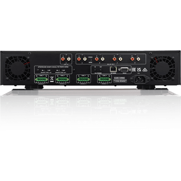 Multi‑room juhtimine: 4 analoog‑sisendit on matrix‑kasutatavad kõigis tsoonides, iga tsooni helitugevuse, bassi ja diskandi seaded reguleeritavad esipaneelilt.