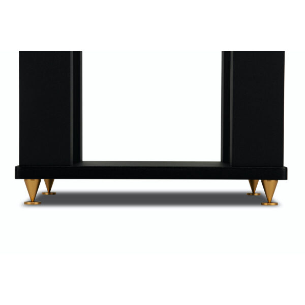 The stands are equipped with large brass-colored aluminum tapered spikes, intentionally enlarged in size to become the highlight of this design. The spikes have a built-in mounting screw. Alternatively, the user can choose silicone feet if the room surface requires it.